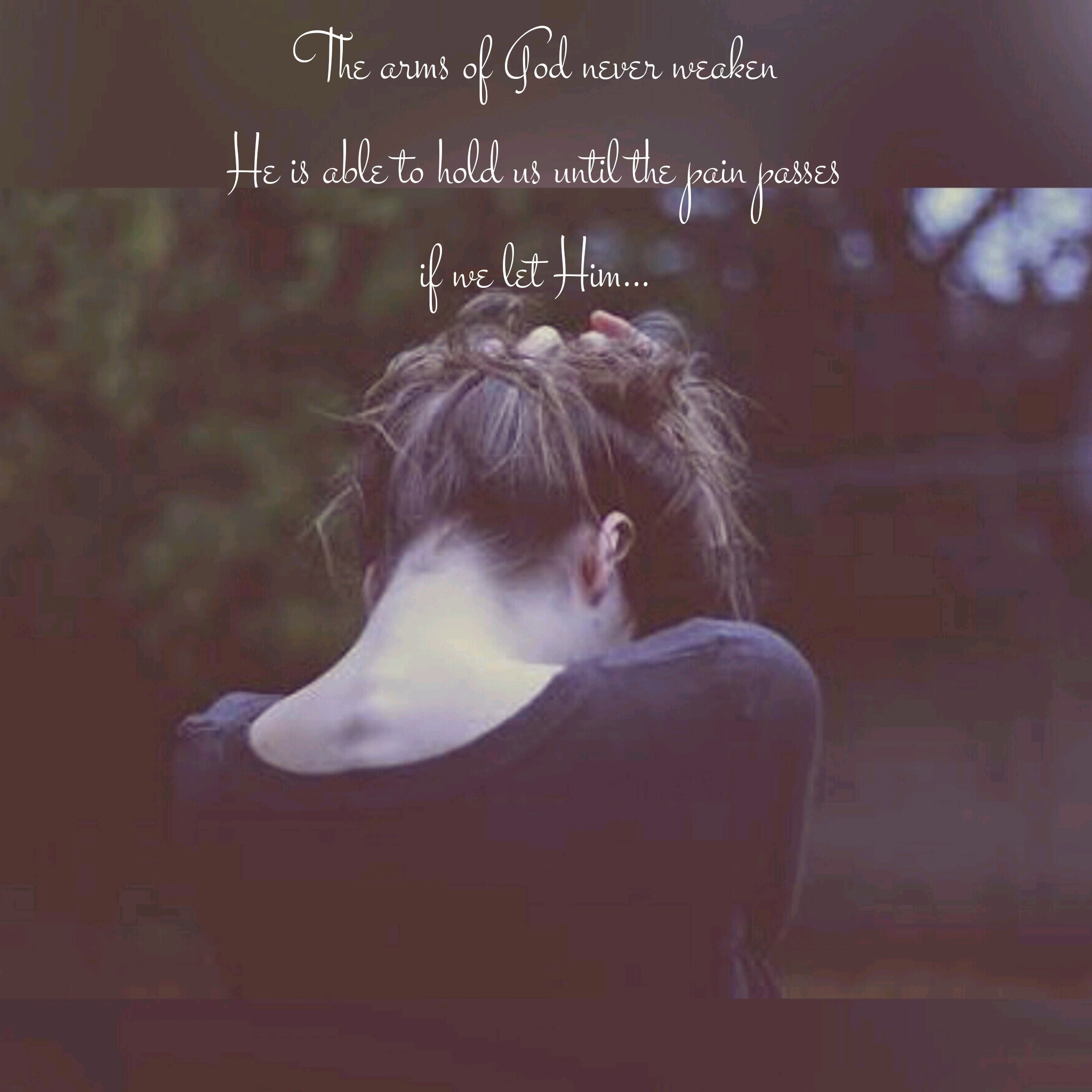 The cries of pain catch my ears. I see you coming towards me, tears pouring down your face. You’re hurting, and I know exactly where. Your hand covers your heart, I see you trying to hold the broken pieces together. I want to embrace you so you know you’re not alone. If you let me, I’ll hold you forever, as long as it takes. I’ll hold you close. I’ll tell you that the pain won’t last forever, that I understand how it hurts. I know my words won’t take all the pain away, but I want to give you hope to help you endure until joy comes in the morning, until your cries turn into laughter, your tears disapear, and you get a glimpse of the goodness I am bringing. For now though, you can just rest in my embrace and find shelter from the storm. In my arms, I whisper my promises over you, count on them…